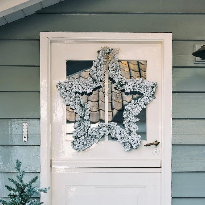 Cette couronne de bienvenue, de style naturel, est à accrocher sur votre porte d’entrée.