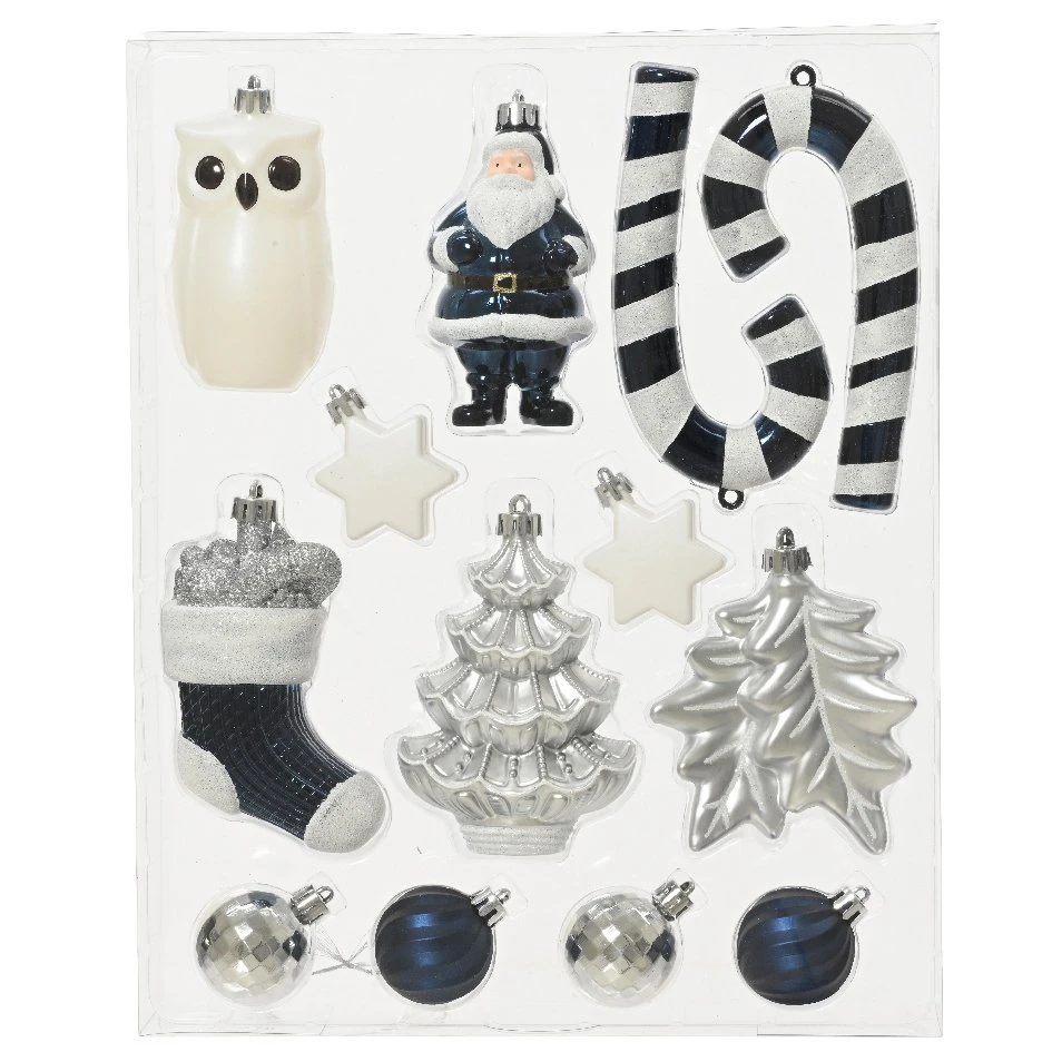 Composition du lot : 1 Père Noël, 2 sapins, 2 sucres d’orge, 1 chouette, 2 étoiles, 1 chaussette et 4 boules. Finitions mates, brillantes et pailletées.