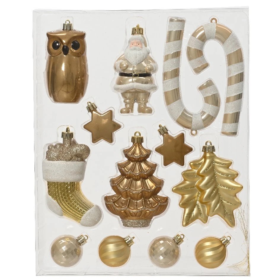 Composition du lot : 1 Père Noël, 2 sapins, 2 sucres d’orge, 1 chouette, 2 étoiles, 1 chaussette et 4 boules. Finitions mates, brillantes et pailletées.