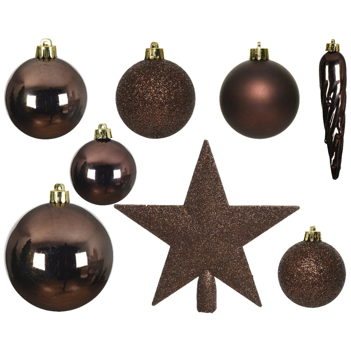 Composition du lot : 18 boules (D 6 cm), 7 boules (D 5 cm), 4 boules (D 8 cm), 3 stalactites à suspendre et 1 cimier (H 20 cm). Mix de boules brillantes, mates et pailletées.
