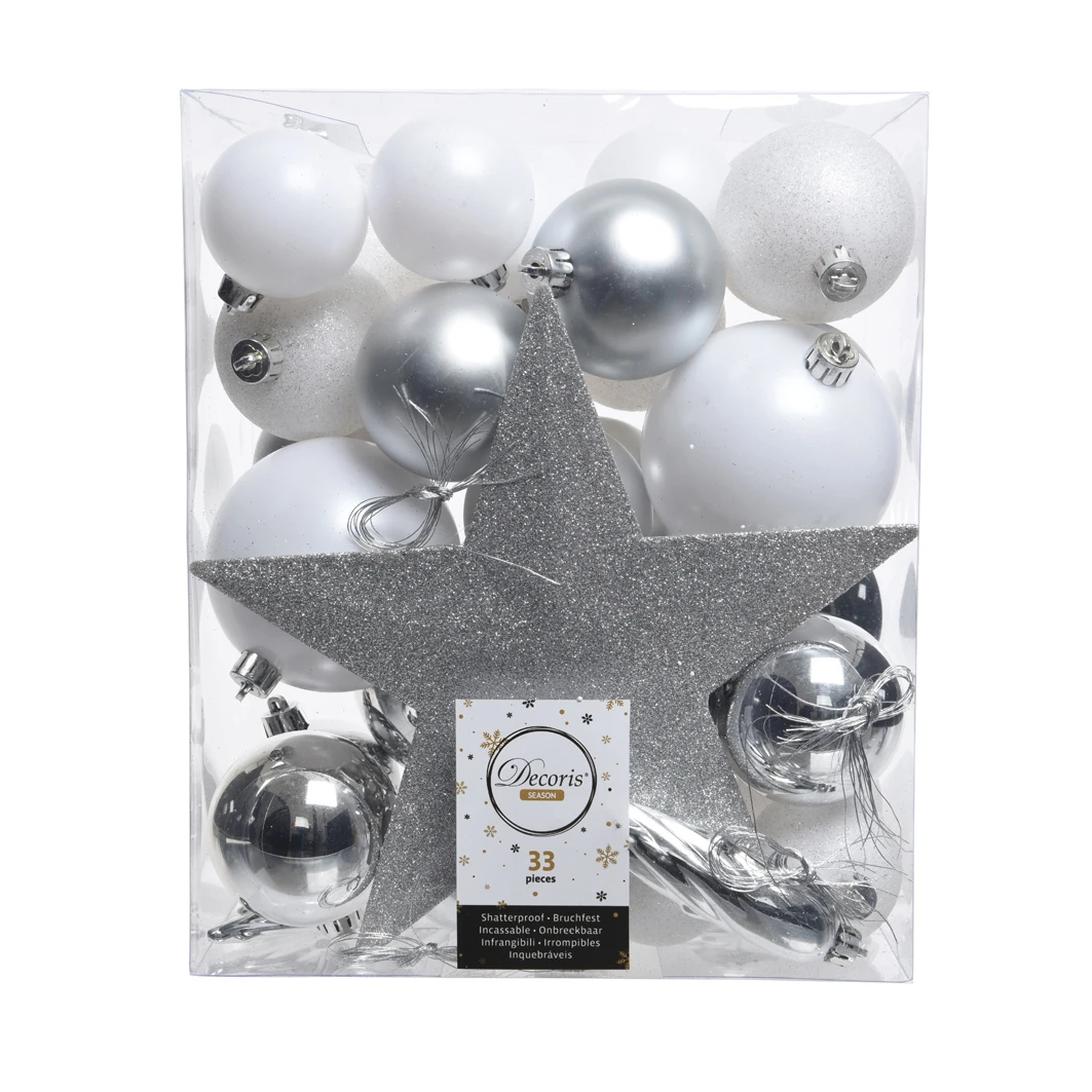 Composition du lot : 18 boules (D6 cm), 7 boules (D5 cm), 4 boules (D8 cm), 3 stalactites à suspendre et 1 cimier (H20 cm). Mix de boules brillantes, mates et pailletées.
