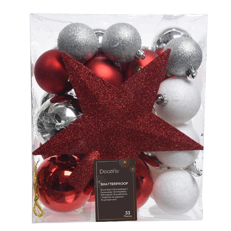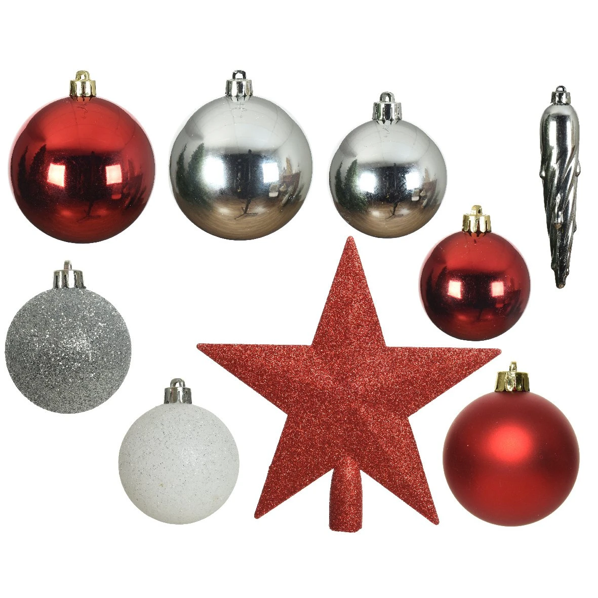 Composition du lot : 18 boules (D6 cm), 7 boules (D5 cm), 4 boules (D8 cm), 3 stalactites à suspendre et 1 cimier (H20 cm). Mix de boules brillantes, mates et pailletées.