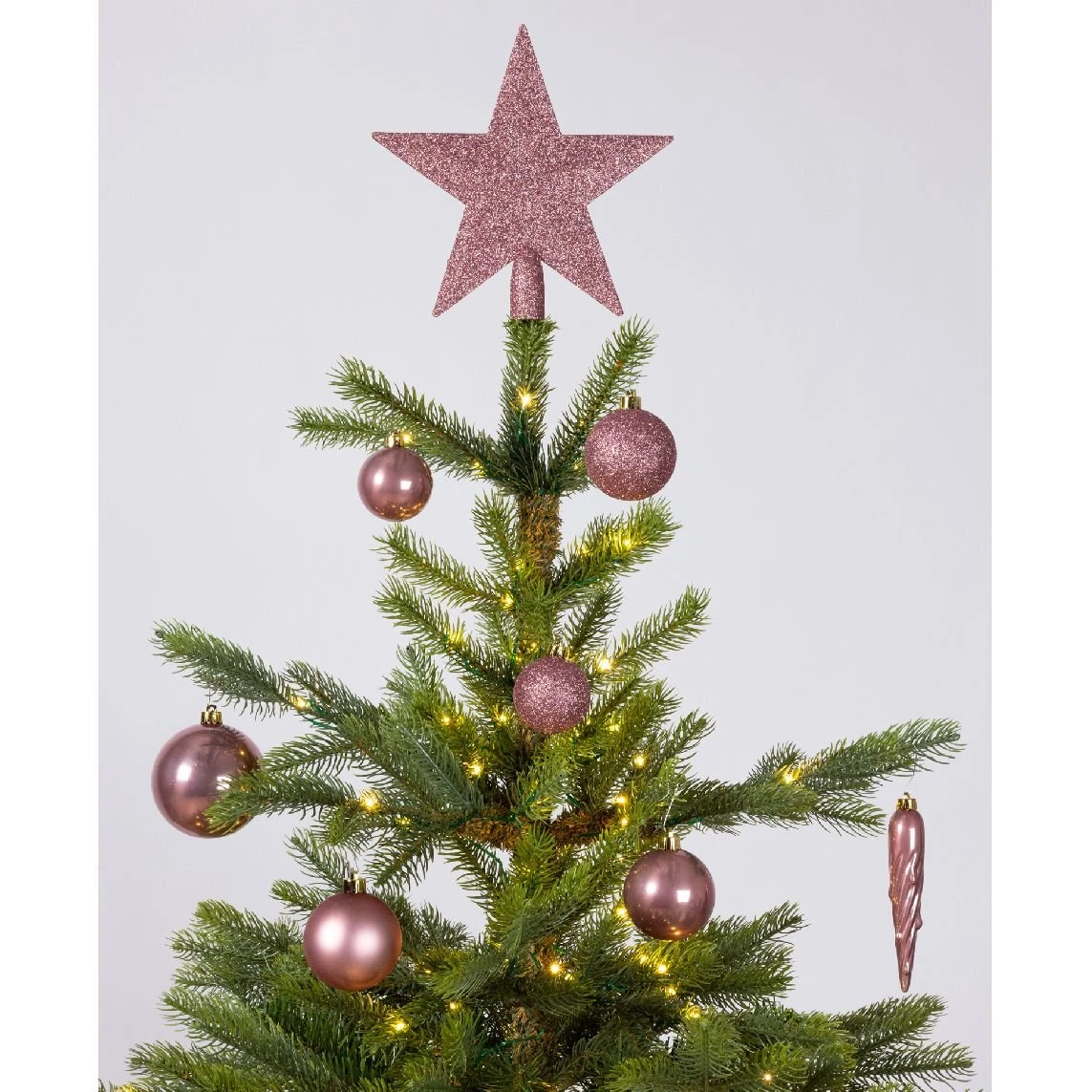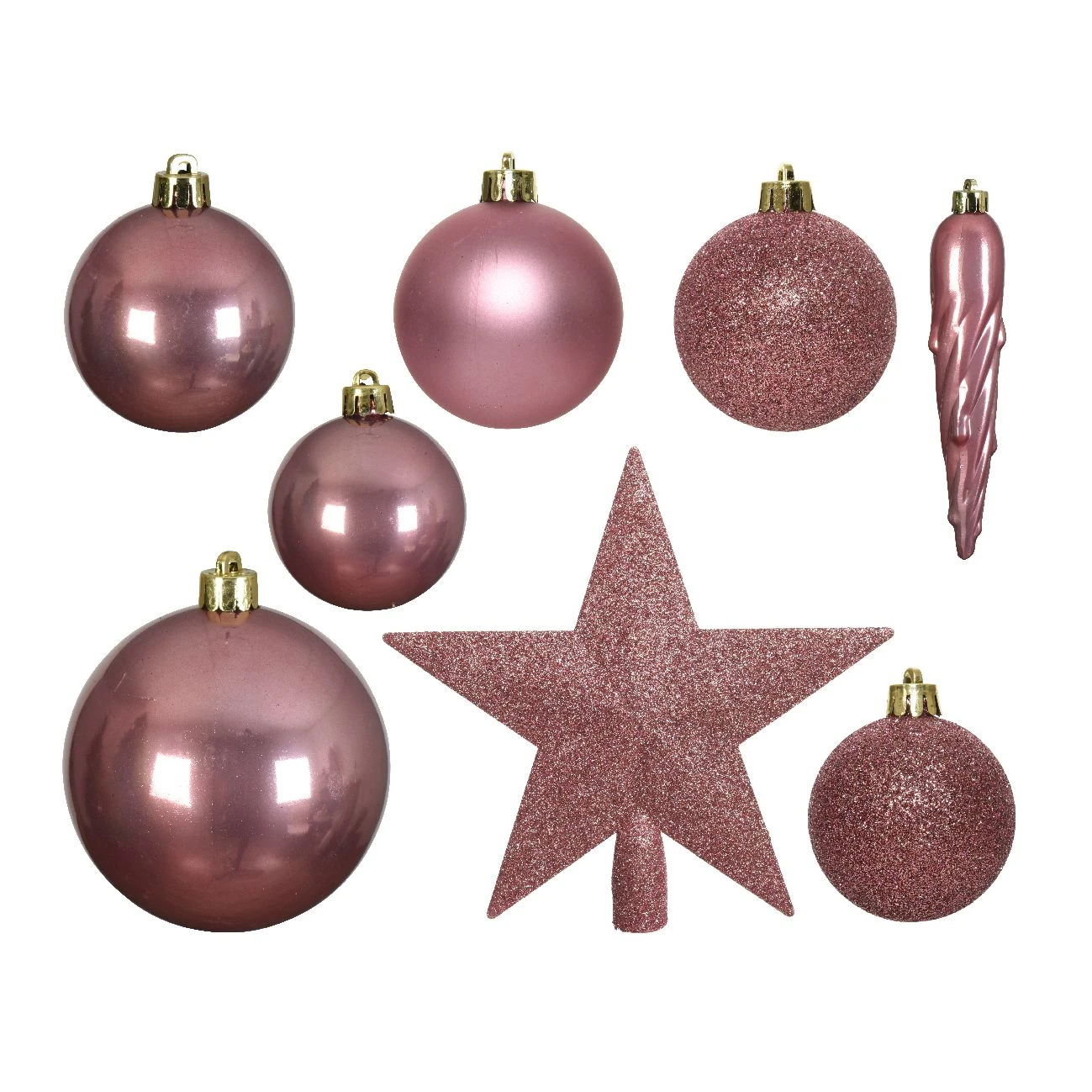 Composition du lot : 18 boules (D 6 cm), 7 boules (D 5 cm), 4 boules (D 8 cm), 3 stalactites à suspendre et 1 cimier (H 20 cm). Mix de boules brillantes, mates et pailletées.