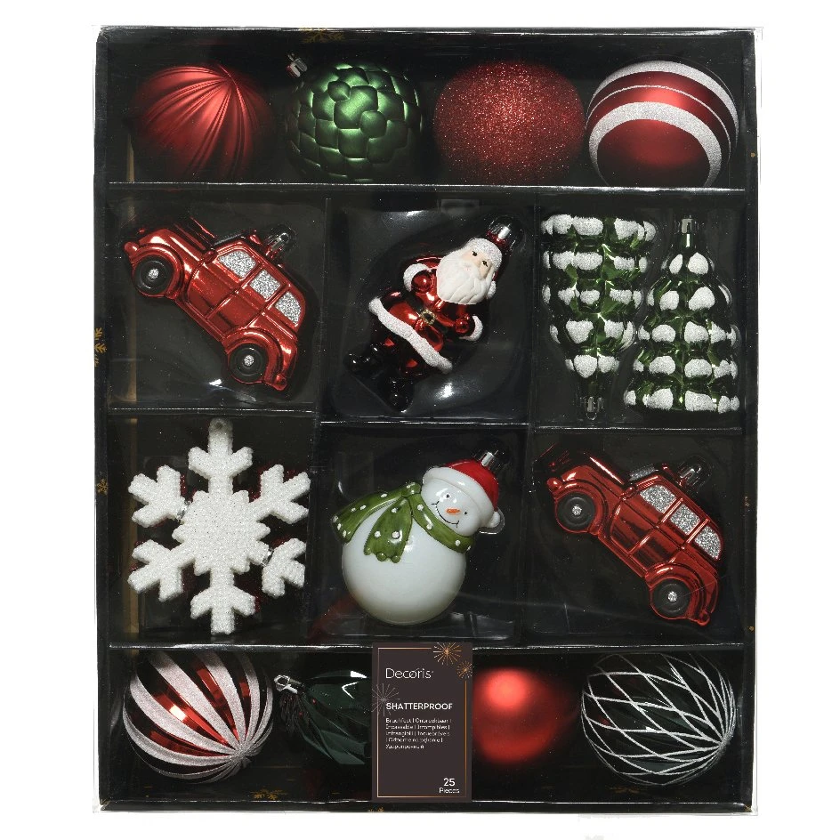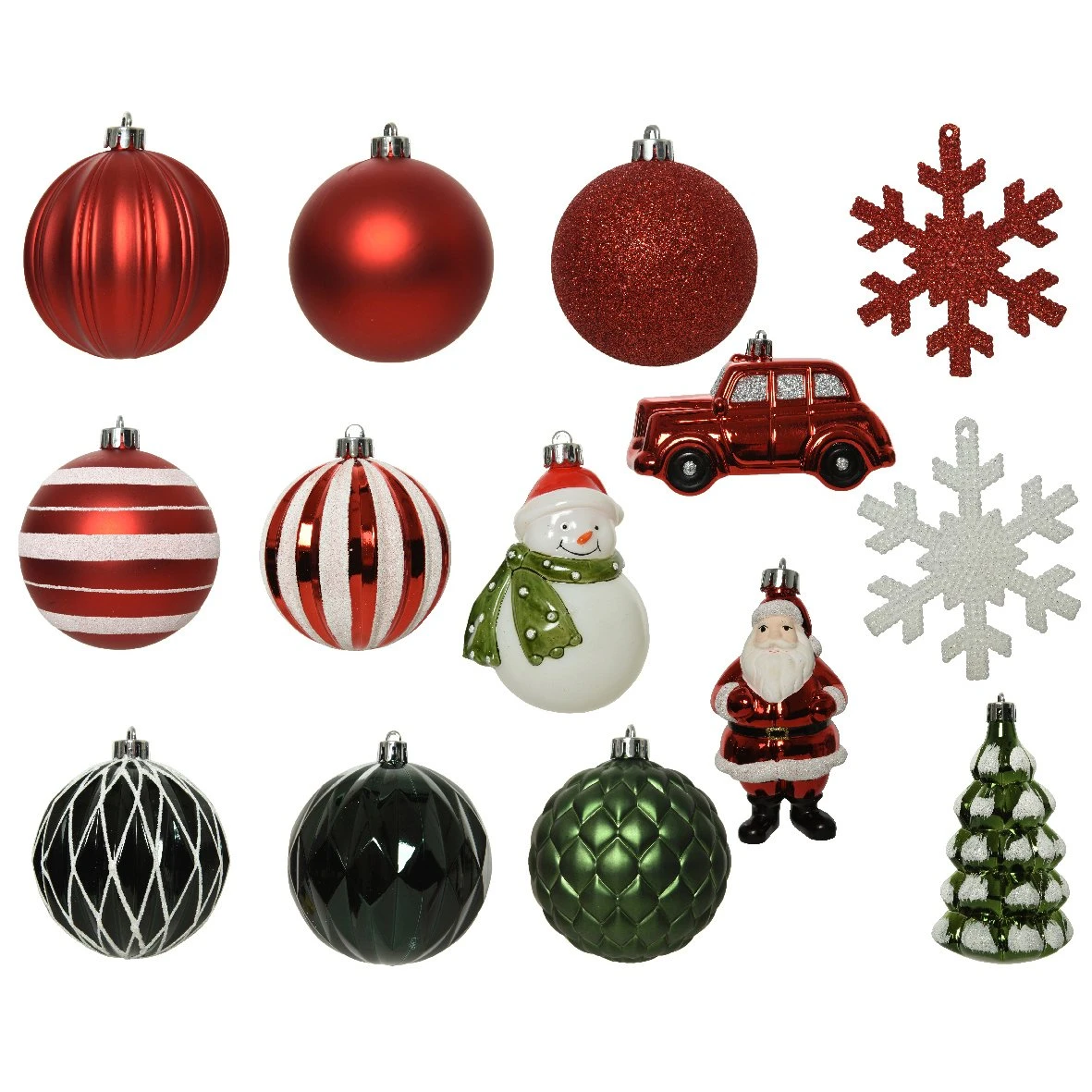 Composition du lot : Ce lot est composé de 2 bonhommes de neige; 2 sapins; 2 voitures; 11 flocons et 8 boules de 8 cm. Les attaches sont comprises et de couleur Or.