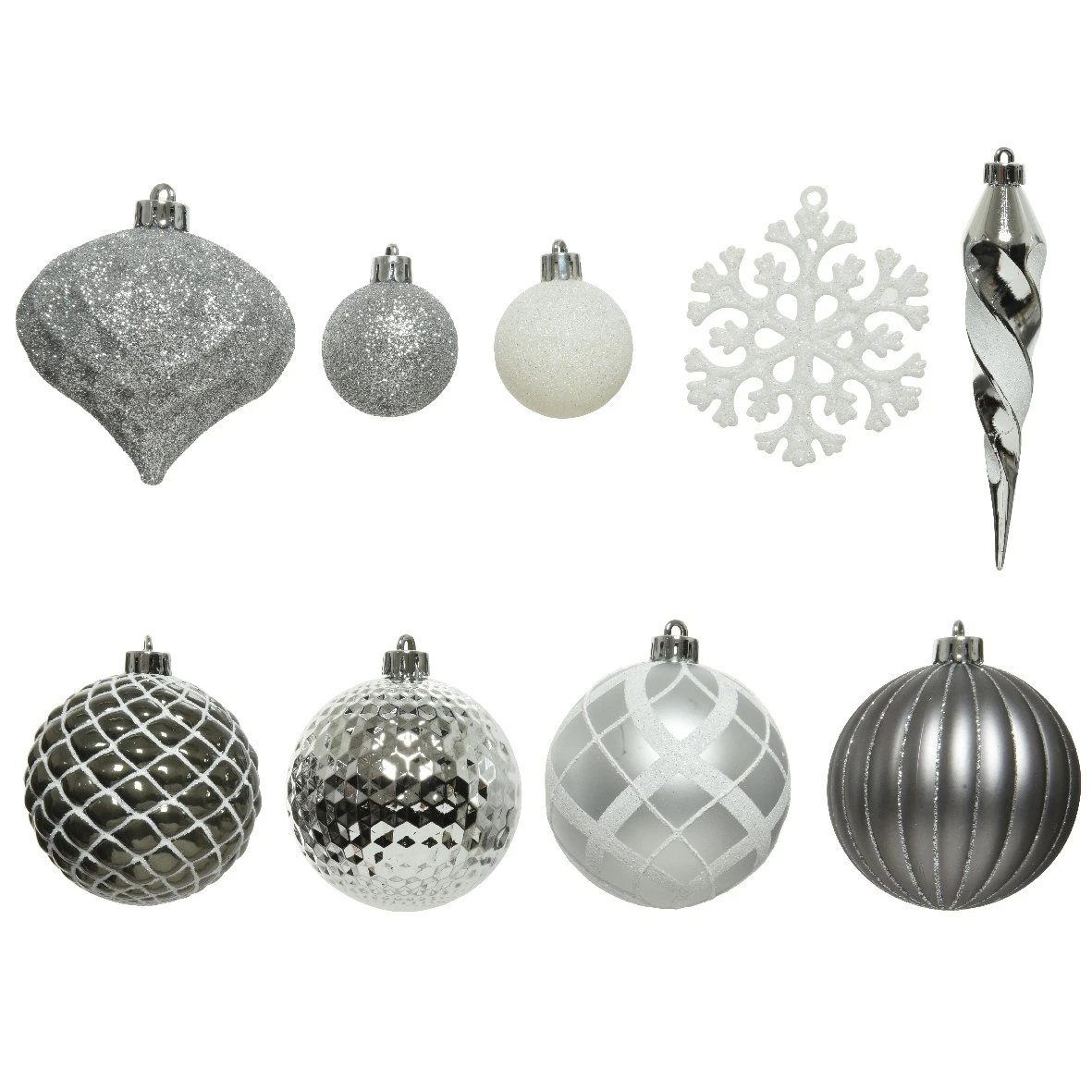Composition du lot : 9 boules (D80 mm) 16 boules (D40 mm) 16 flocons (D80 mm) 1 bulbe (D80 mm) 8 stalactites (H15 cm). Mix de boules brillantes, mates et pailletées.