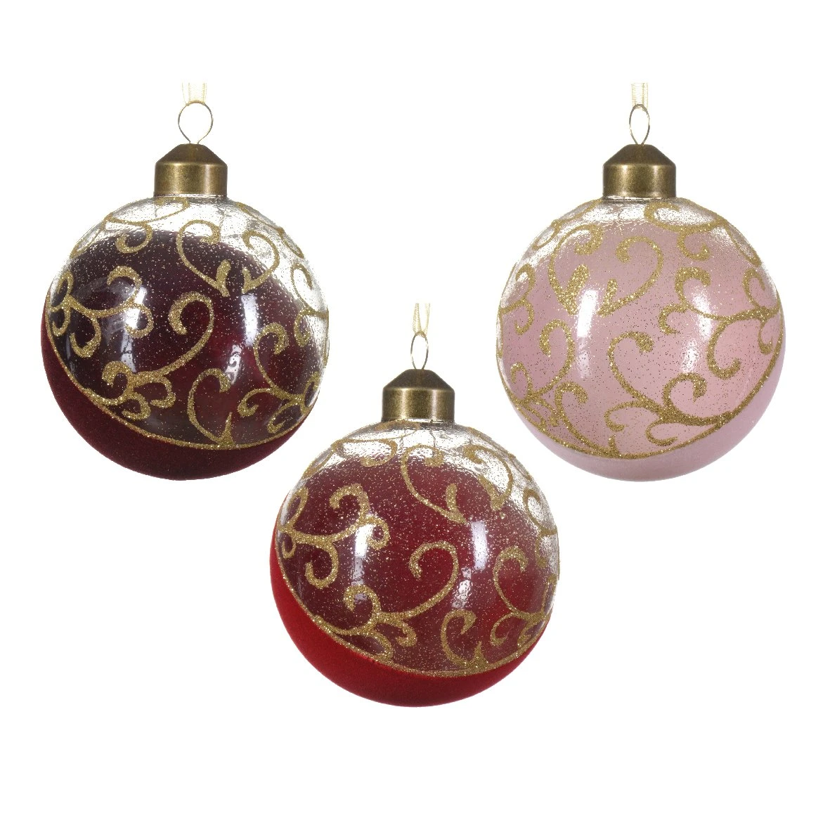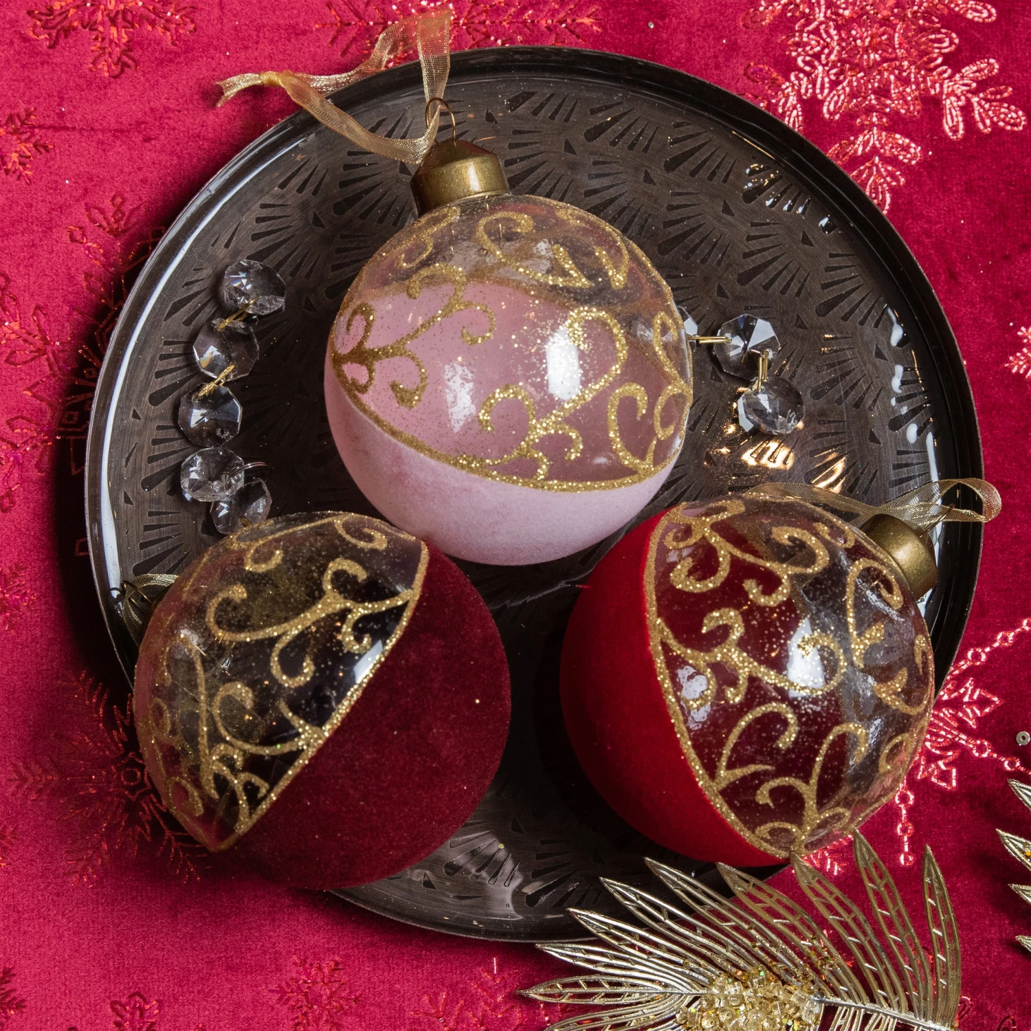 Lot composé de 12 boules de couleurs rouge, bordeaux et rose.