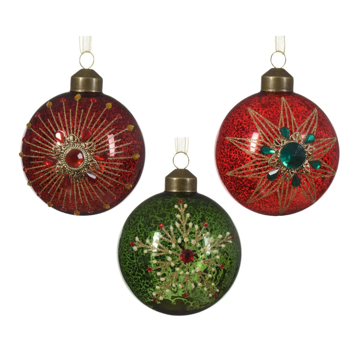 Lot de 12 boules en verre de couleurs bordeaux, rouge et vert.