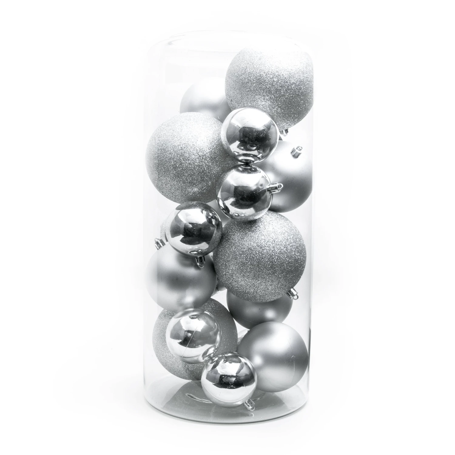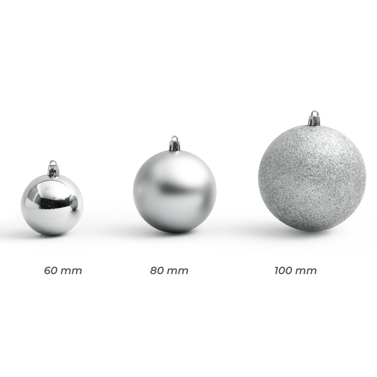 Composition du lot : 10 boules brillantes (D60 mm) , 6 boules mattes (D80 mm) et 4 boules à paillettes (D100 mm).
