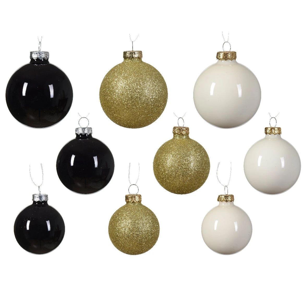 Lot de 21 boules brillantes et pailletées. 5 boules de 70 mm, 10 boules de 60 mm et 6 boules de 50 mm.