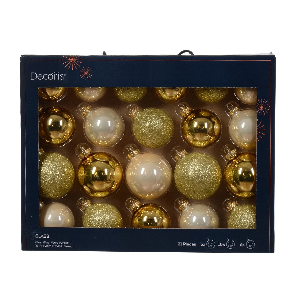 Lot de 21 boules brillantes et pailletées. 5 boules de 70 mm, 10 boules de 60 mm et 6 boules de 50 mm.