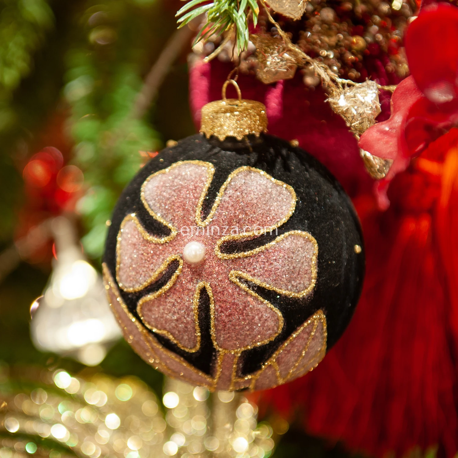 De charmants motifs fleuris sur cette boule de Noël pour un sapin doux.