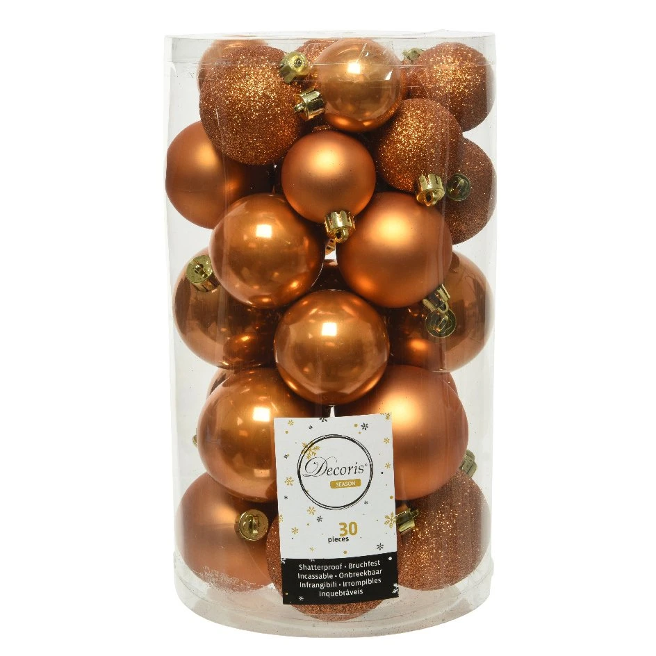 12 boules brillantes (4 de chaque taille) , 9 boules mattes (3 de chaque taille) et 9 boules à paillettes (3 de chaque taille).