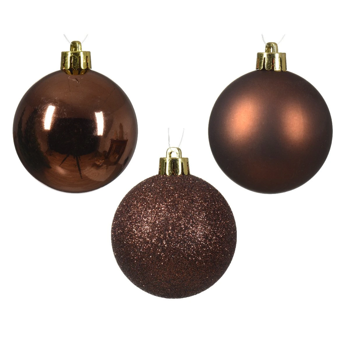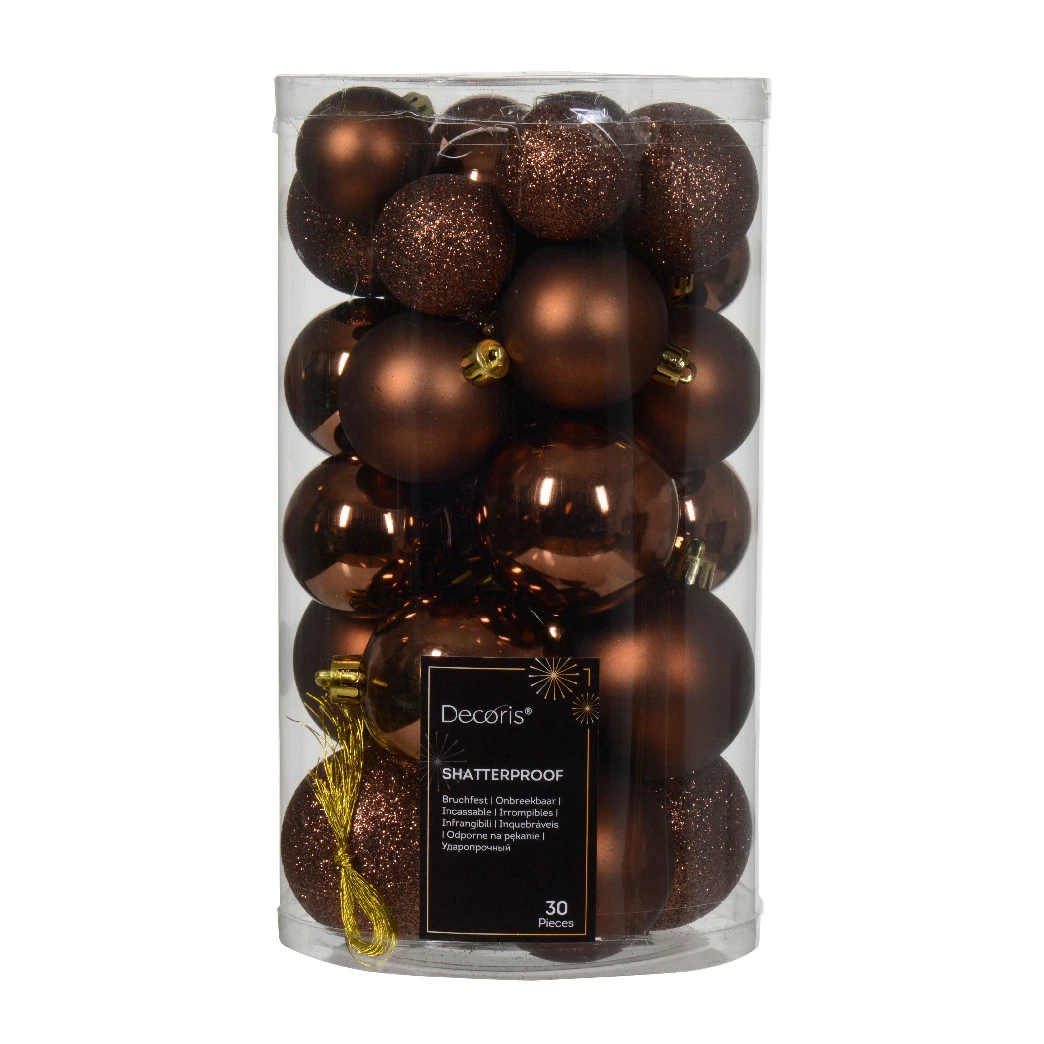 12 boules brillantes (4 de chaque taille) , 9 boules mattes (3 de chaque taille) et 9 boules à paillettes (3 de chaque taille).