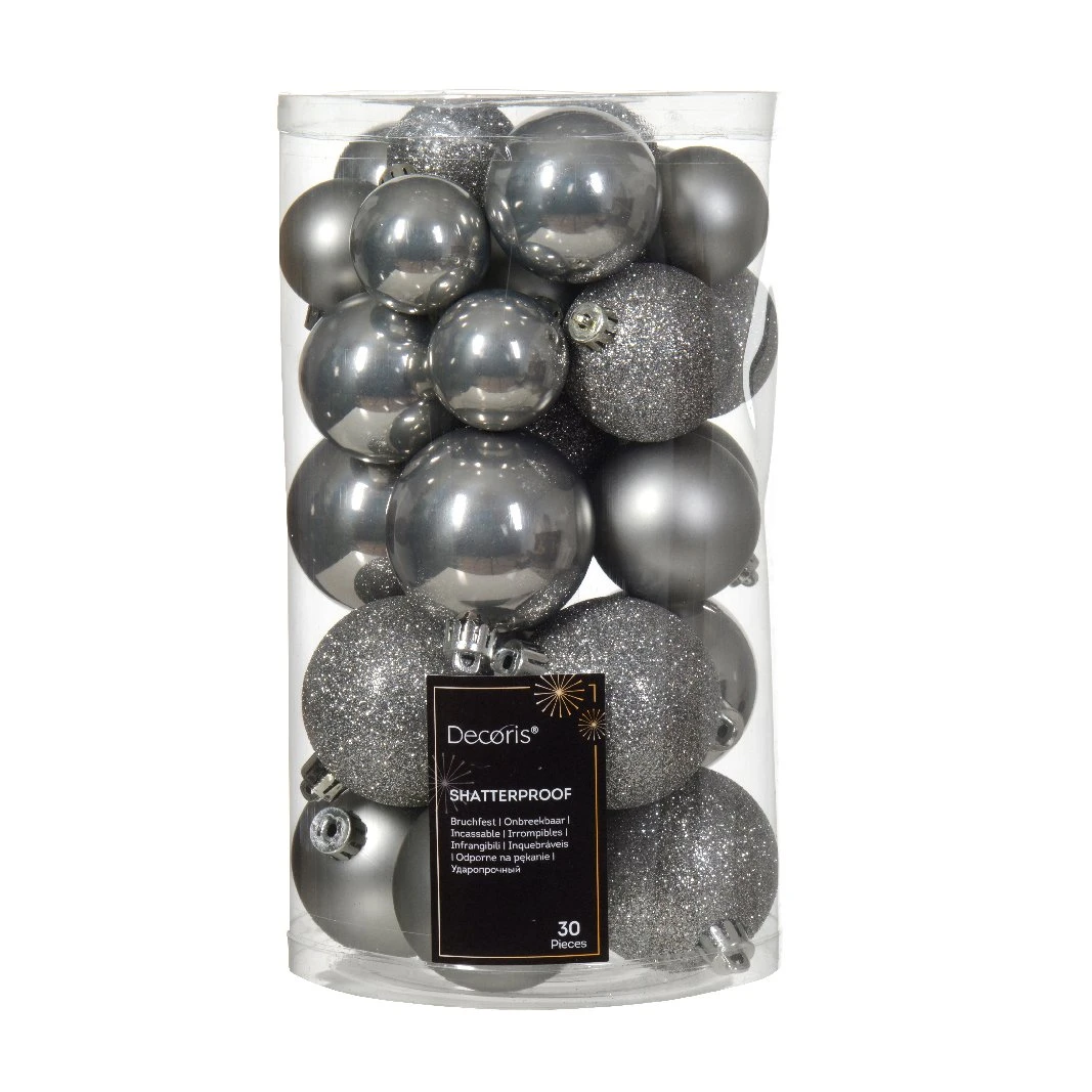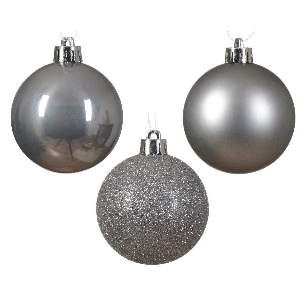 12 boules brillantes (4 de chaque taille) , 9 boules mattes (3 de chaque taille) et 9 boules à paillettes (3 de chaque taille).