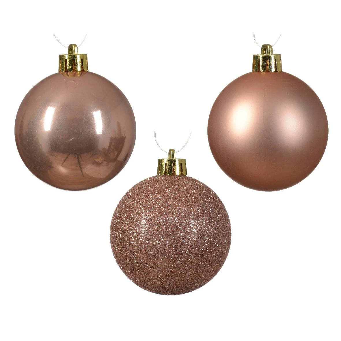 12 boules brillantes (4 de chaque taille) , 9 boules mattes (3 de chaque taille) et 9 boules à paillettes (3 de chaque taille).