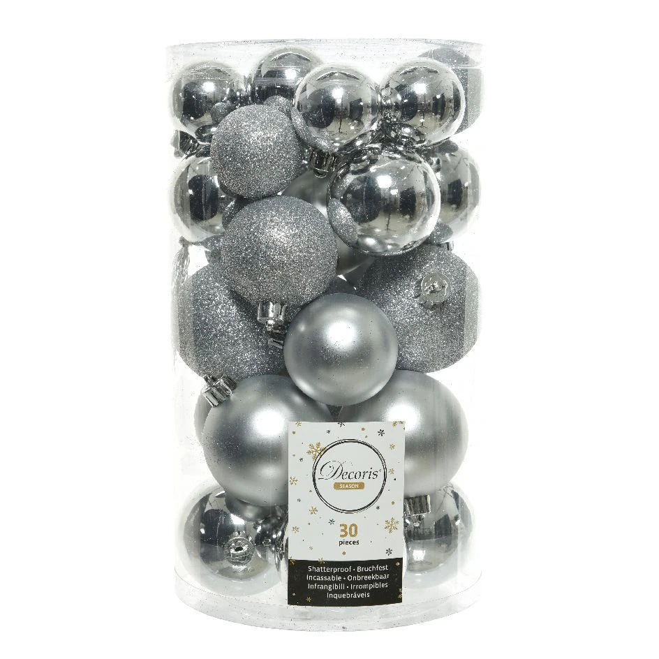 12 boules brillantes (4 de chaque taille) , 9 boules mattes (3 de chaque taille) et 9 boules à paillettes (3 de chaque taille).