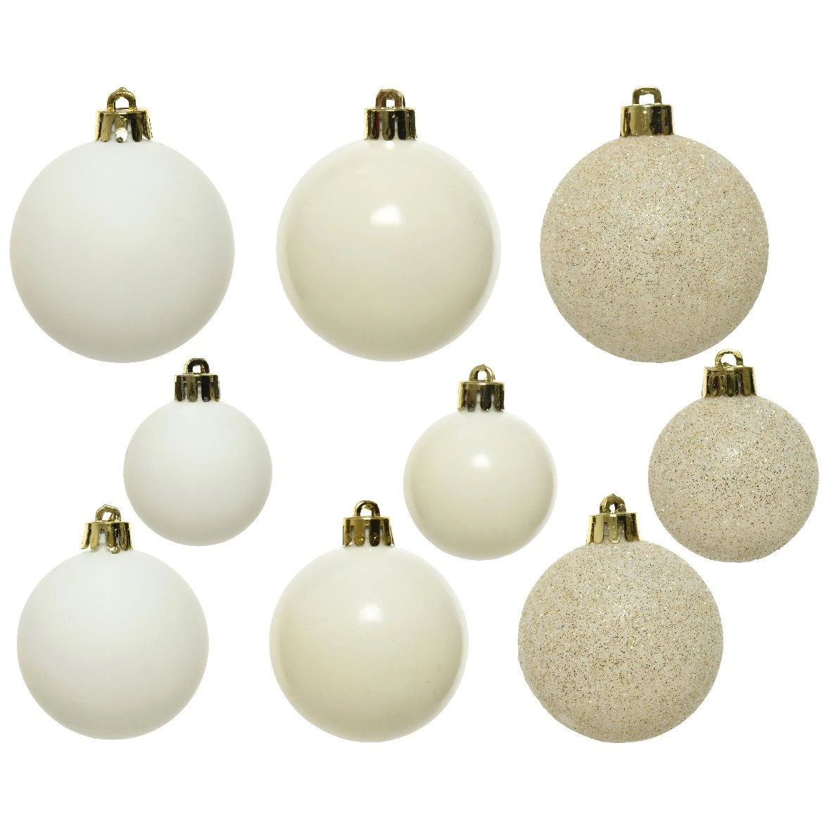 12 boules brillantes (4 de chaque taille) , 9 boules mattes (3 de chaque taille) et 9 boules à paillettes (3 de chaque taille).