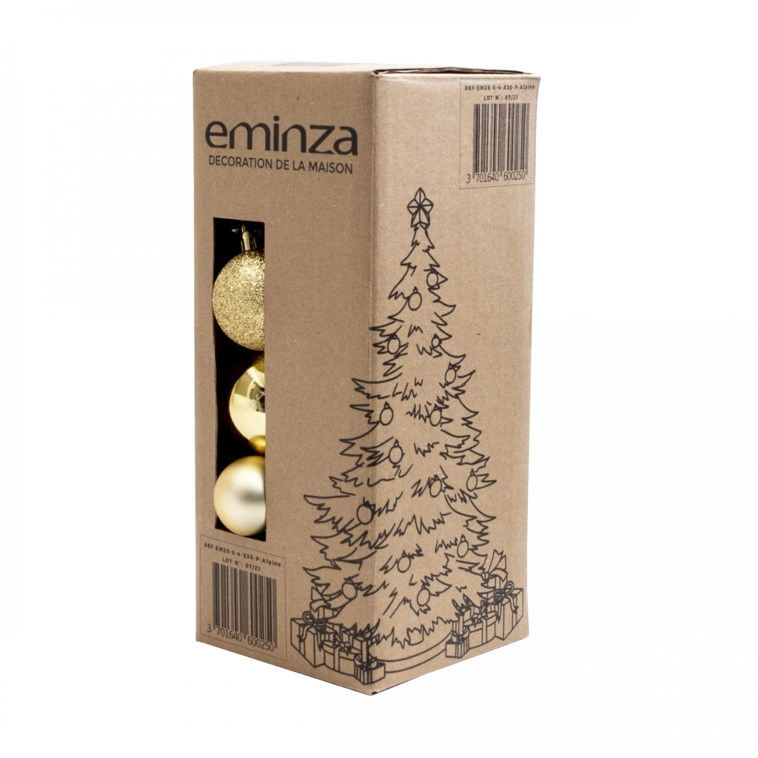 12 boules brillantes (4 de chaque taille) , 9 boules mattes (3 de chaque taille) et 9 boules à paillettes (3 de chaque taille). 30 attaches en métal incluses.