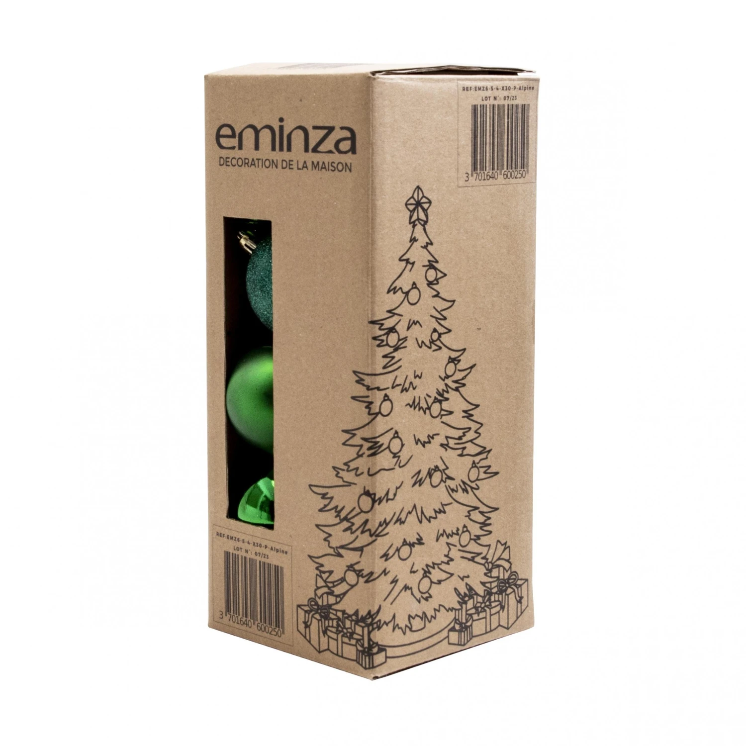 12 boules brillantes (4 de chaque taille) , 9 boules mates (3 de chaque taille) et 9 boules à paillettes (3 de chaque taille). 30 attaches en métal incluses.