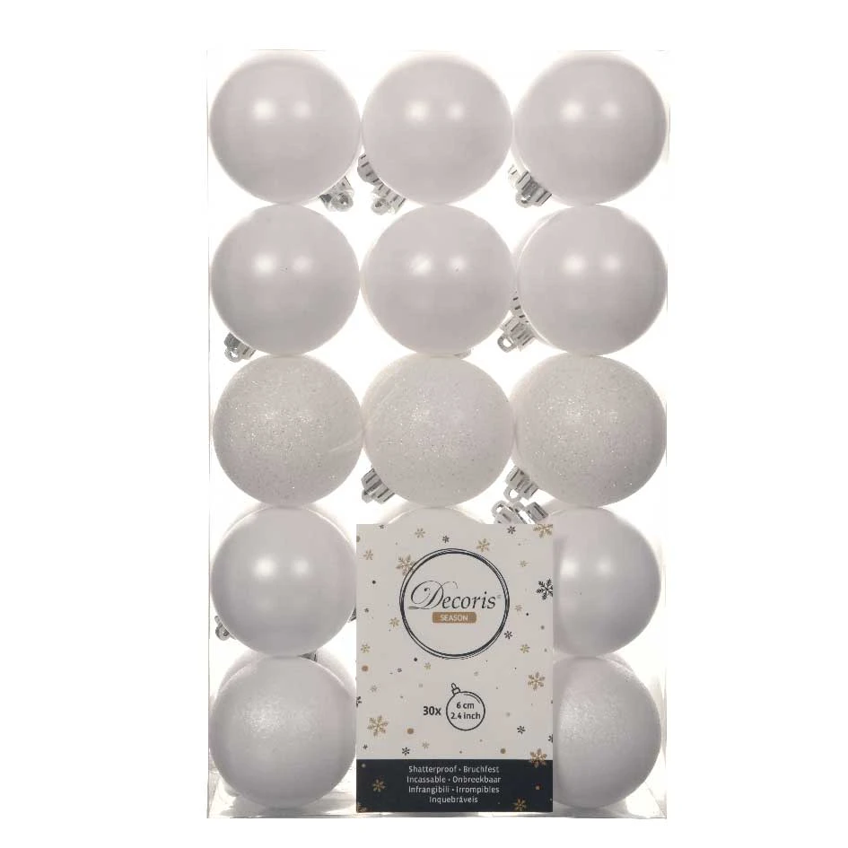 Composition du lot : ce lot est composé de 30 boules brillantes, pailletées et mates. Diamètre 60 mm.