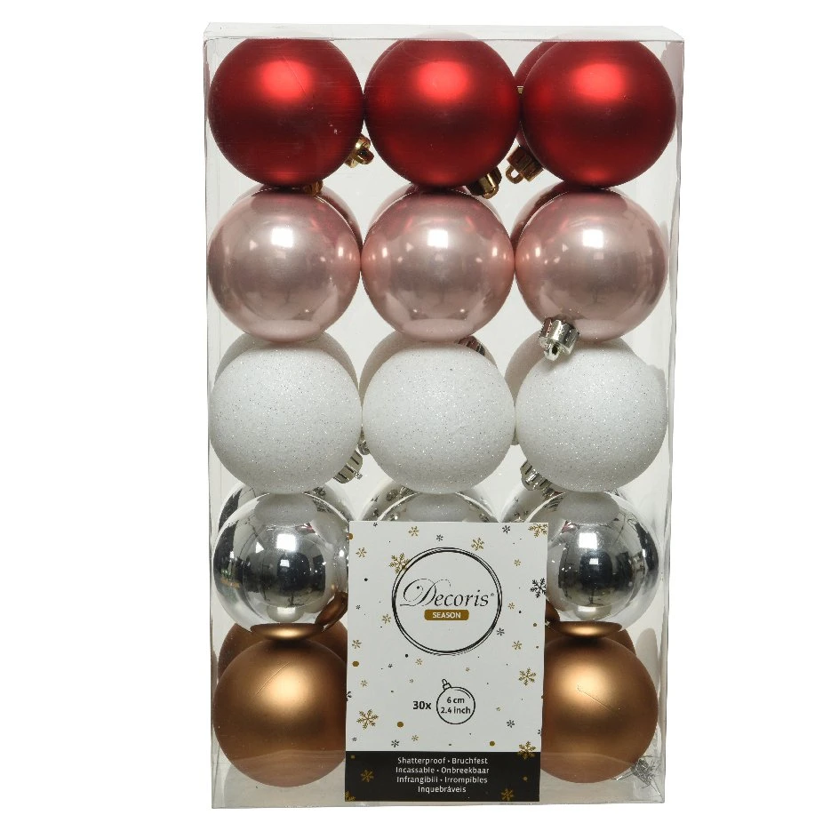 Un lot de boules incassables aux couleurs parfaitement accordées les unes aux autres. Une décoration de sapin aisée et subtilement exécutée.
