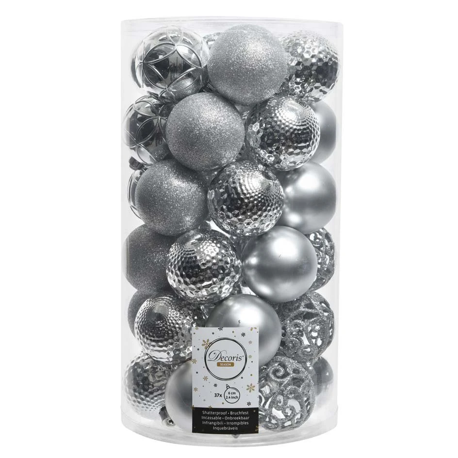 Composition du lot : 37 boules (D60 mm) : 19 boules brillantes, 12 boules pailletées et 6 boules mates