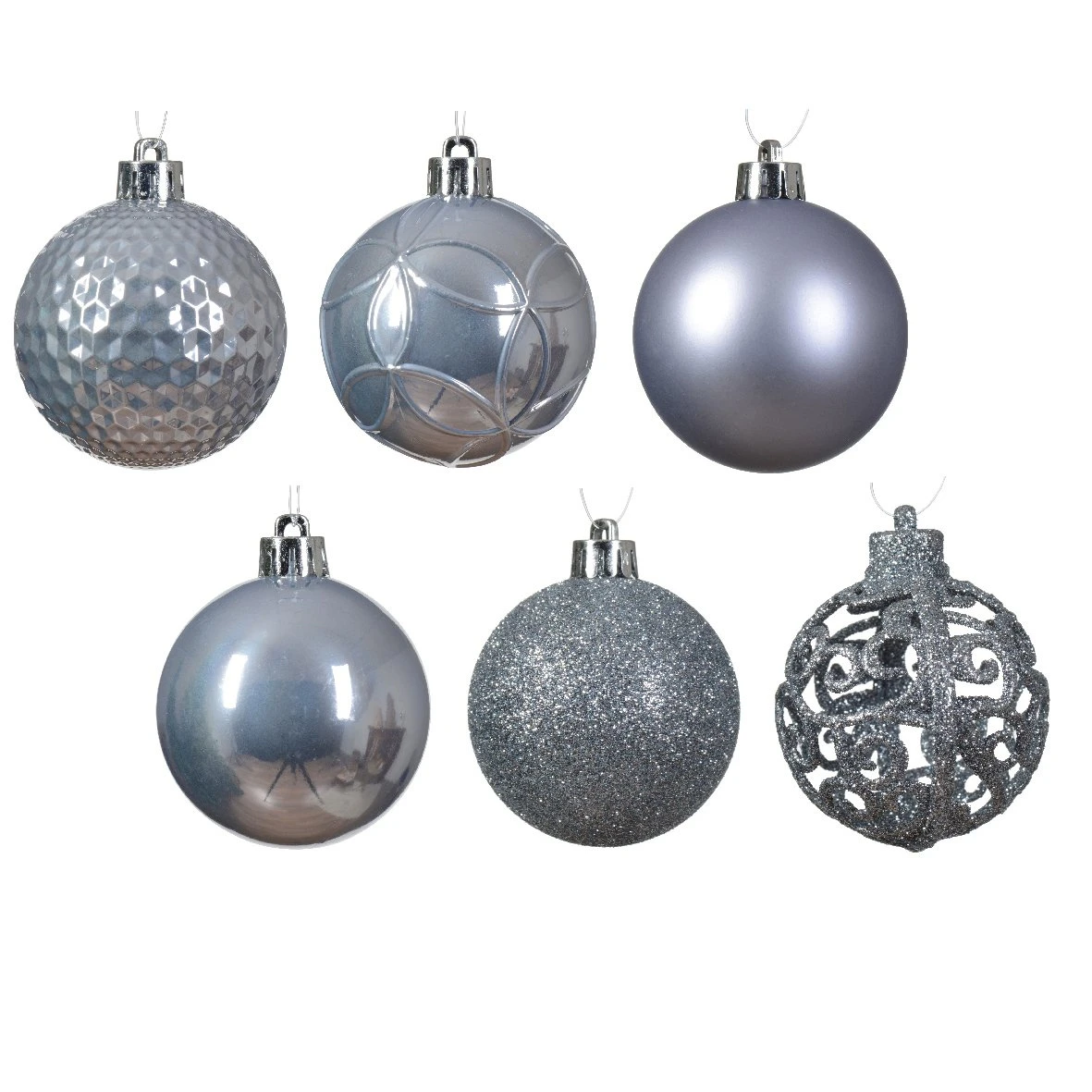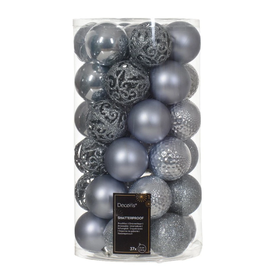 37 boules (D60 mm) : 19 boules brillantes, 12 boules pailletées et 6 boules mates