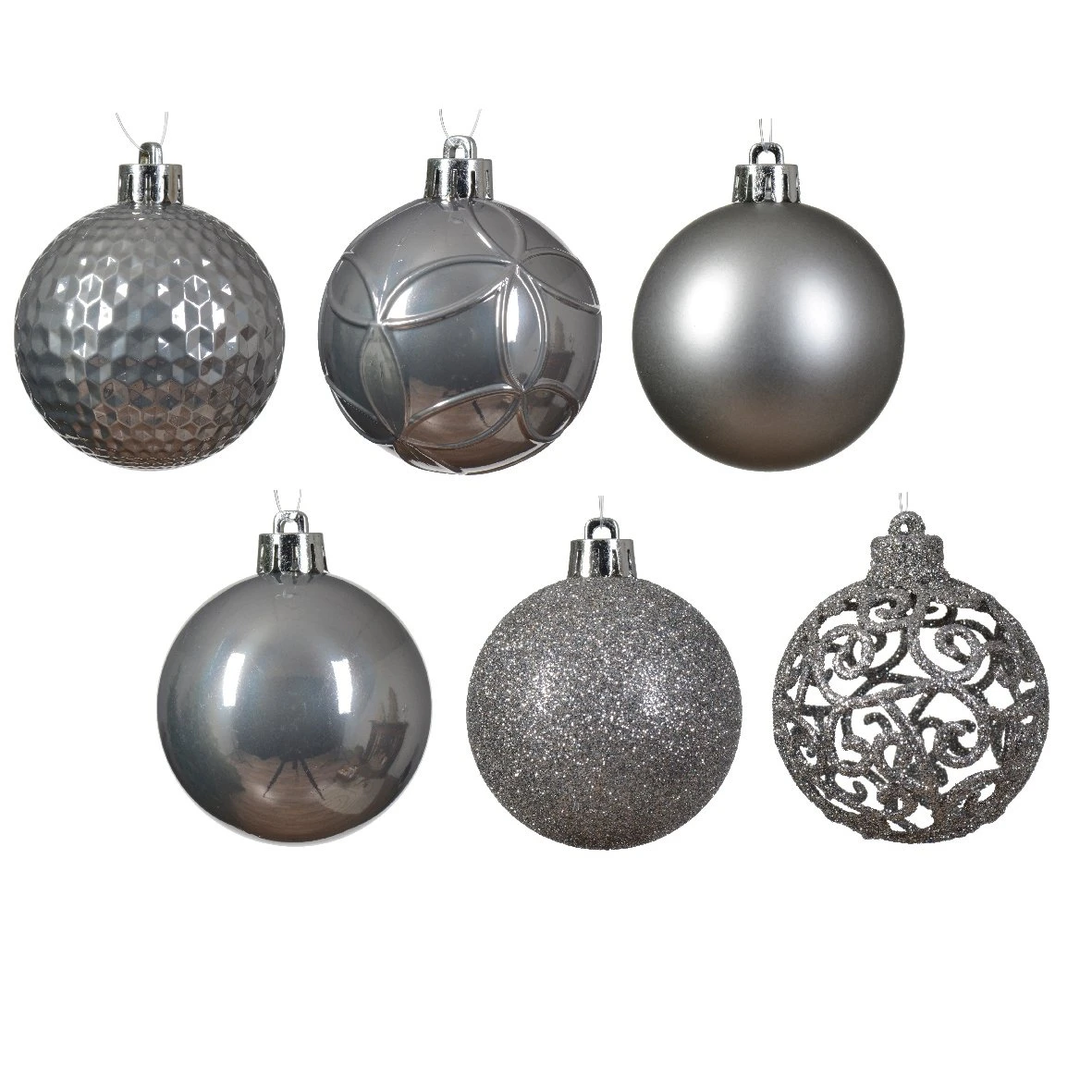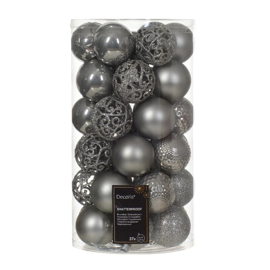 37 boules (D60 mm) : 19 boules brillantes, 12 boules pailletées et 6 boules mates