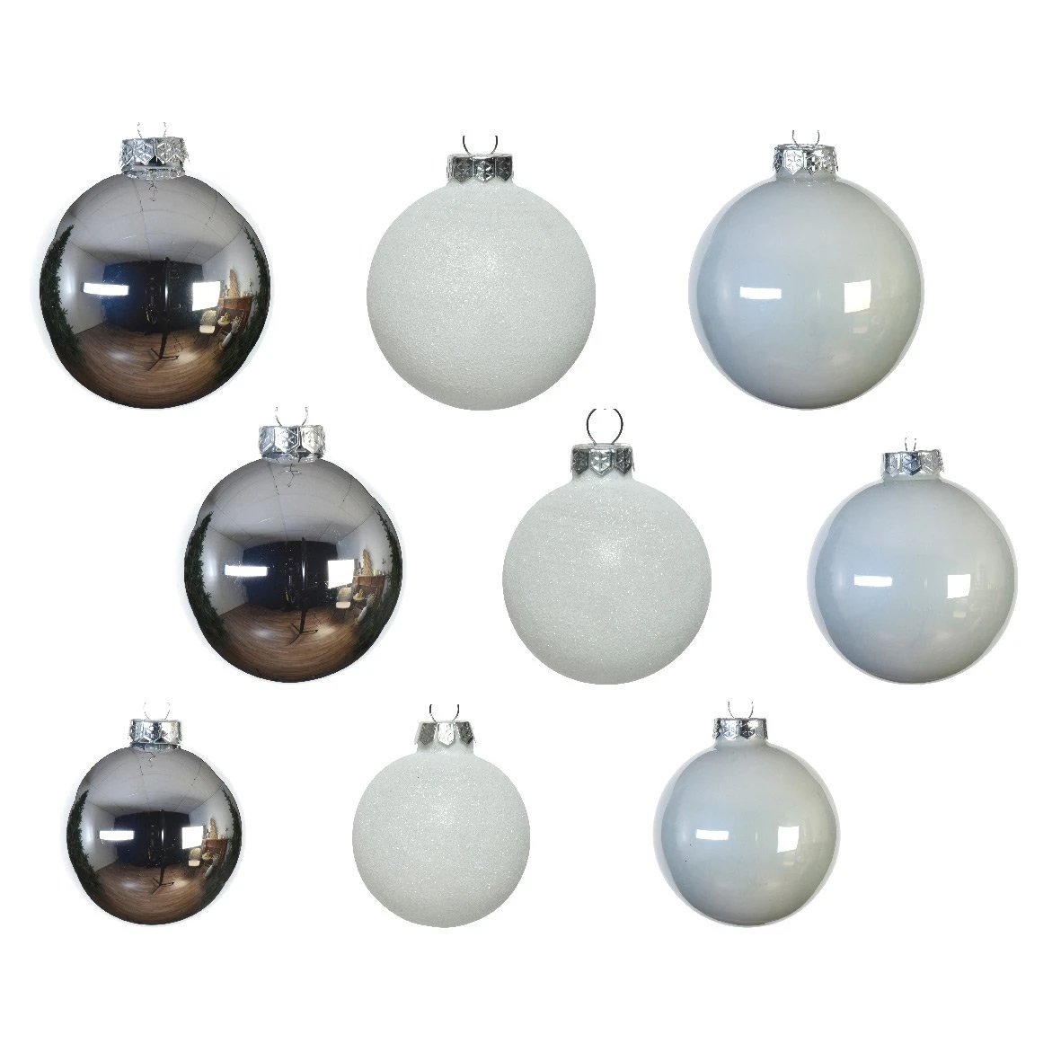 Composition du lot : ce lot est composé de 20 boules de D70 mm (8 brillantes, 8 mates et 4 pailletées), 10 boules de D60 mm (4 brillantes, 4 mates et 2 pailletées) et 12 boules de D50 mm (4 brillantes, 4 mates et 4 pailletées). Attaches de couleur argent.