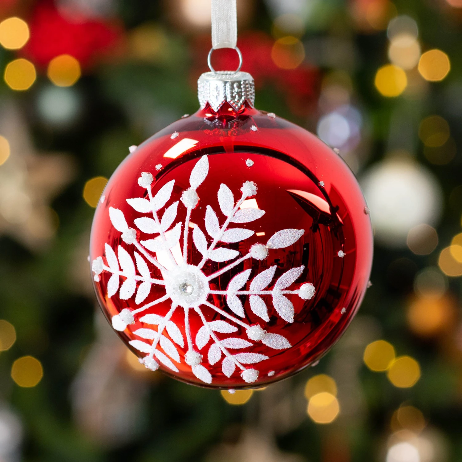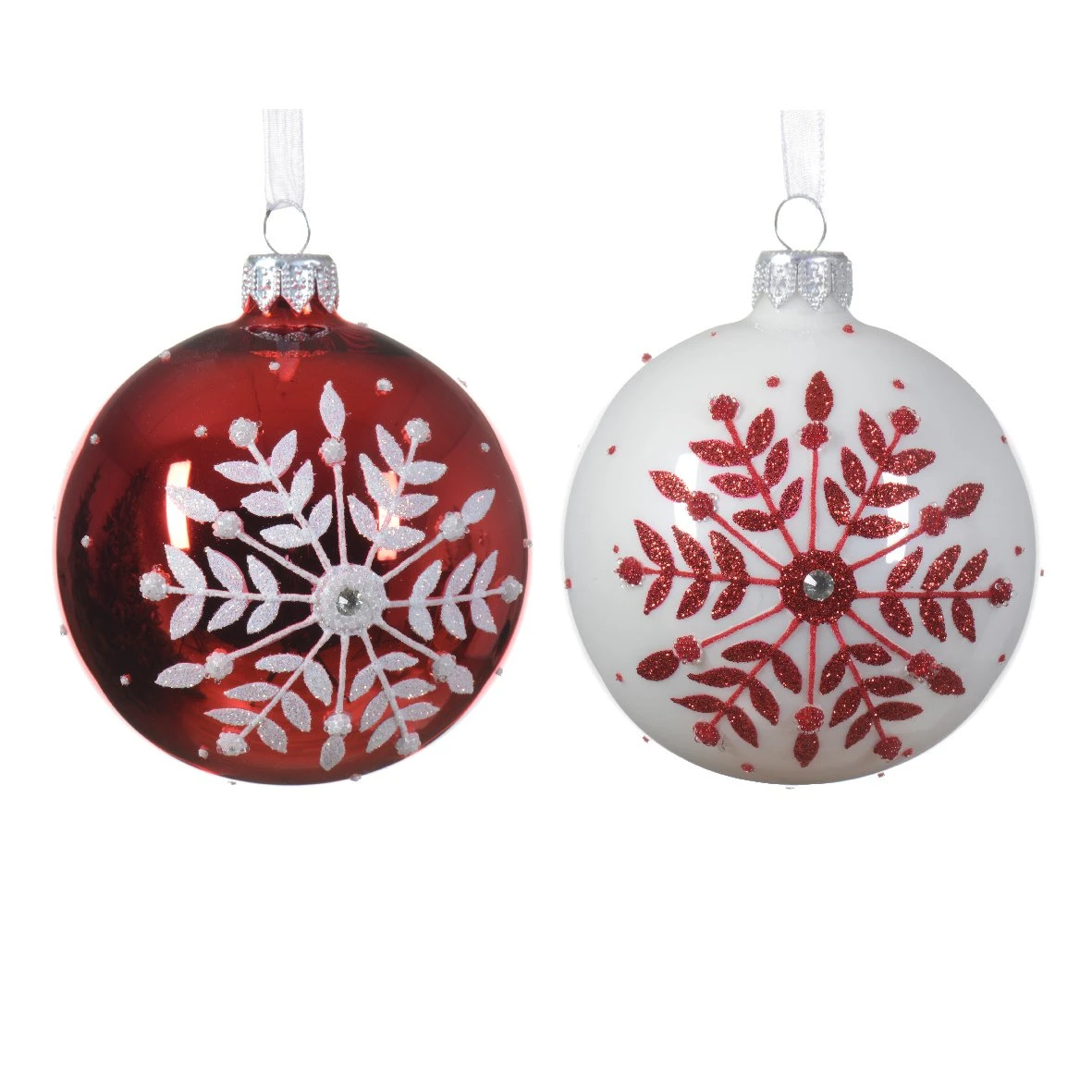 Lot de 6 boules en verre assorties de couleur rouge et blanc brillantes. Fabrication Européenne.