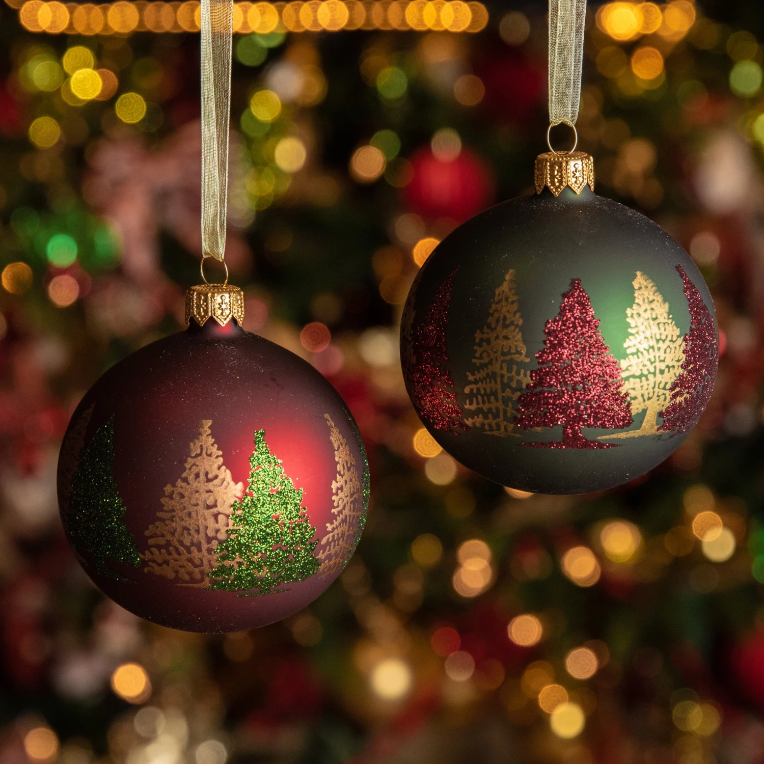 Lot de 6 boules en verre de couleur vert sapin et rouge. Fabrication Européenne.