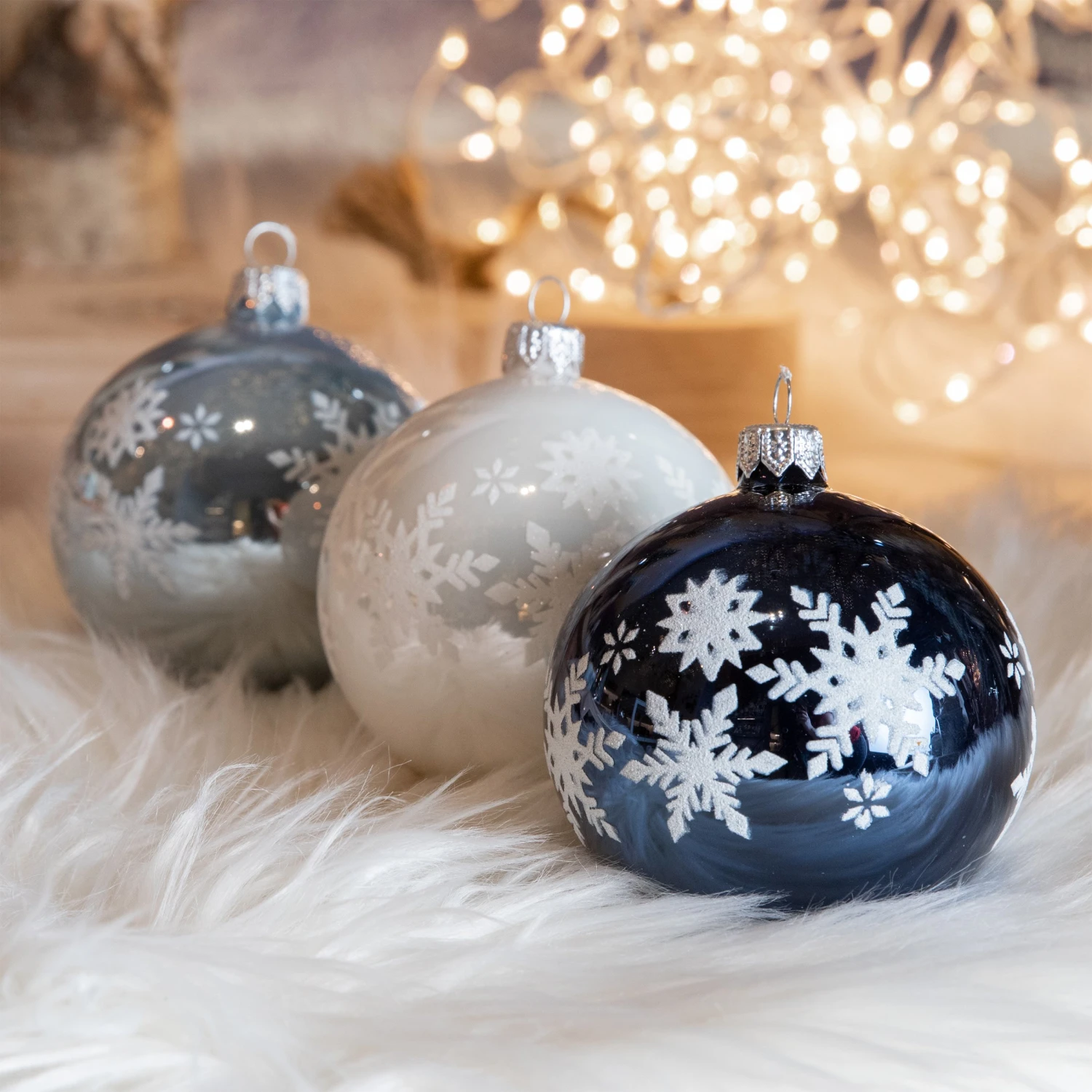 Lot de 6 boules de couleur bleu vaporeux, bleu nuit et blanc. Fabrication Européenne.