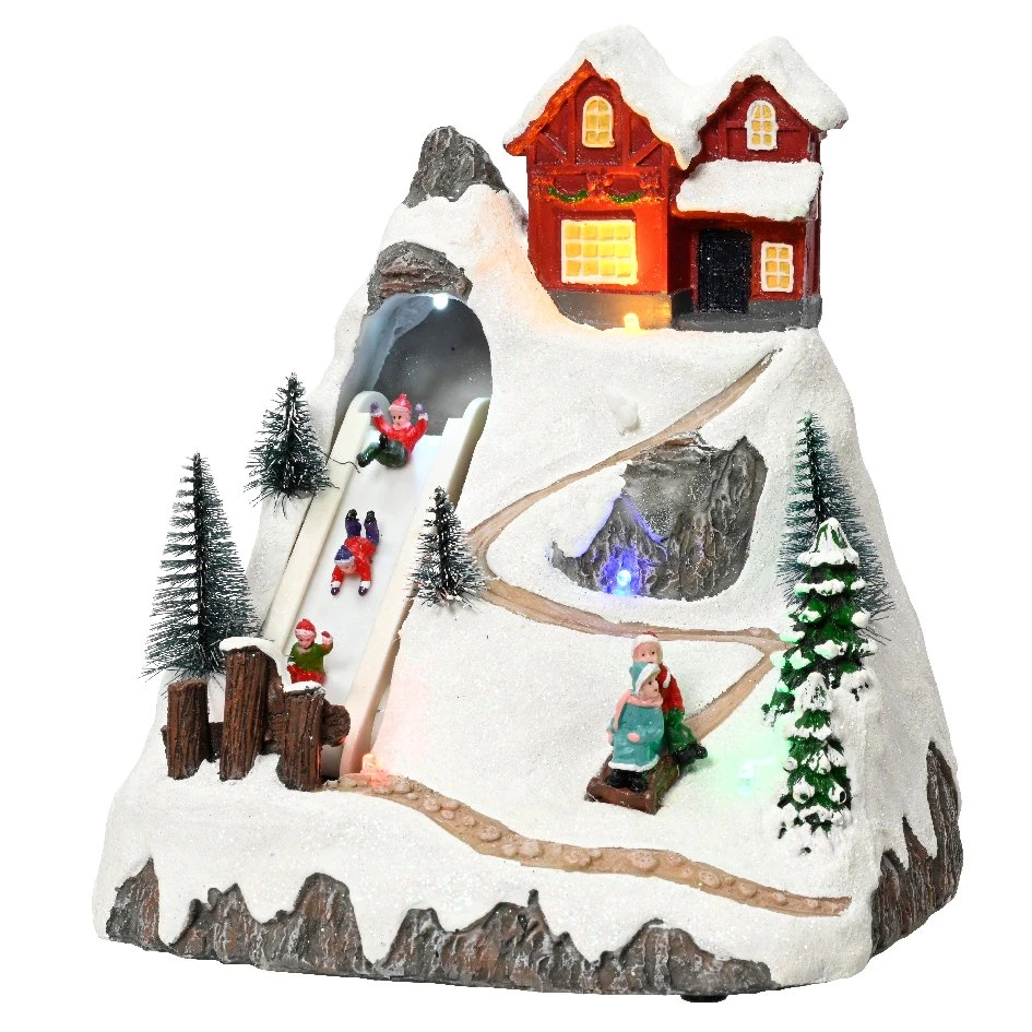 Ce village lumineux est équipé de 5 LED à éclairage fixe. La piste ou les enfants glissent est en mouvement.