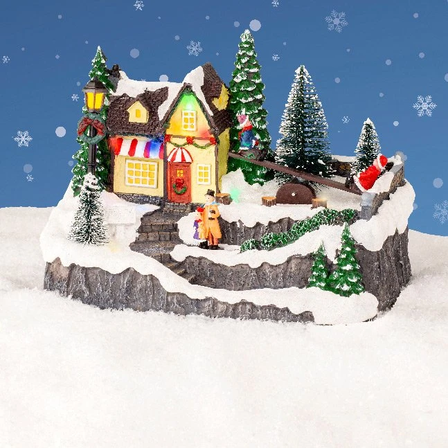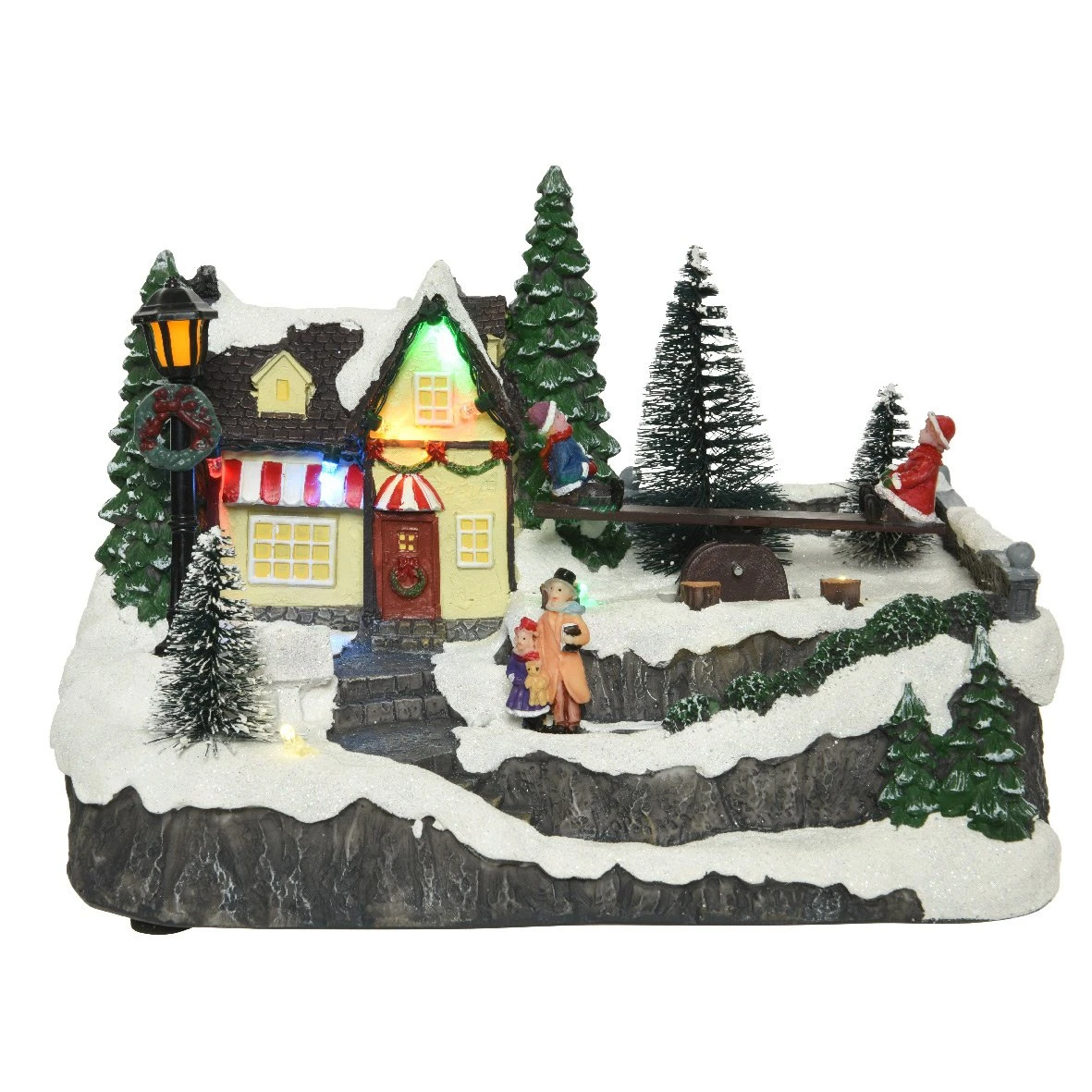 Ce village est équipé de 10 LED non remplaçables et les personnages sur la balançoire sont en mouvement.